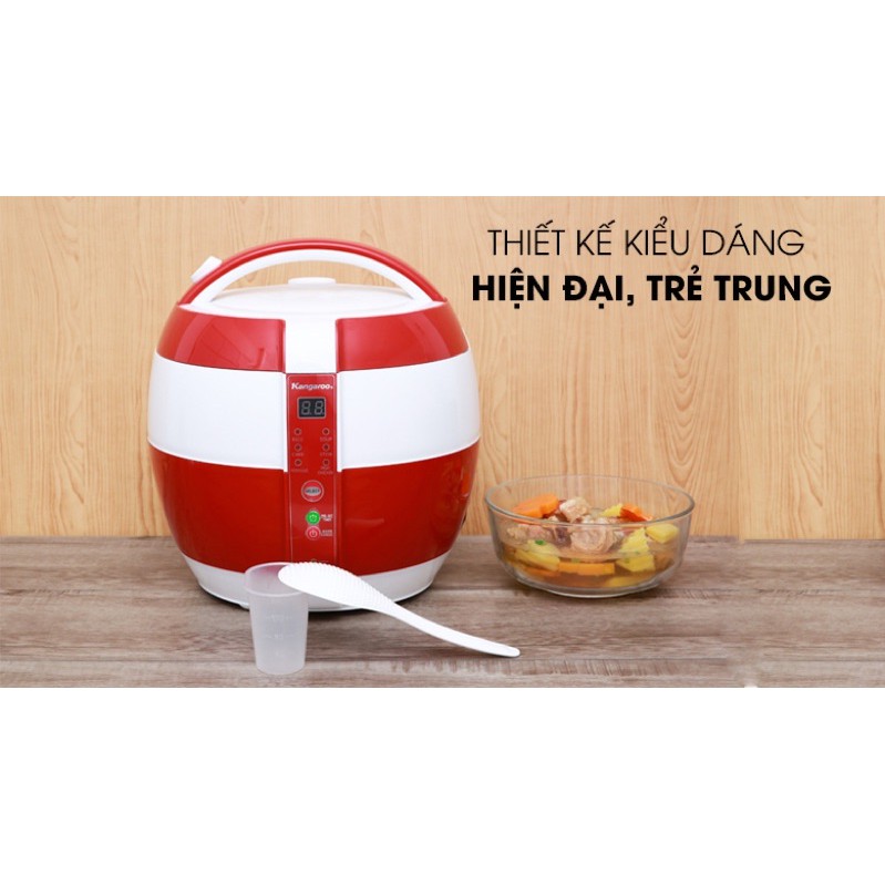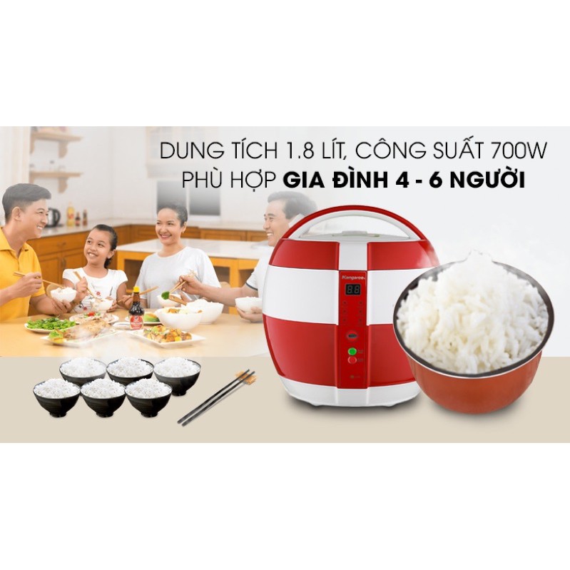 Dung tích 1.8 lít phù hợp cho gia đình 4 - 6 thành viên. Nồi cơm điện thương hiệu Kangaroo Đặc điểm sản phẩm Loại nồi:Nồi cơm nắp gài Dung tích nồi:1.8 lít Số người ăn:4 - 6 người Chất liệu lòng nồi:Hợp kim nhôm phủ chống dính Công nghệ nấu:3D (Toả nhiệt từ 3 hướng) Chức năng nấu:Nấu cơm Hâm nóng Nấu cháo Hấp Làm bánh Tiện ích:Nồi chống dính Điều khiển:Nút nhấn có màn hình hiển thị Dây điện:Có thể tháo rời khỏi nồi Công suất:700 W Độ dày lòng nồi:2 mm Kích thước:Ngang 29 cm - Cao 30.2 cm - Sâu 29 cm Khối lượng:3.2 kg Thương hiệu của:Việt Nam Nơi sản xuất:Trung Quốc Năm ra mắt:2020