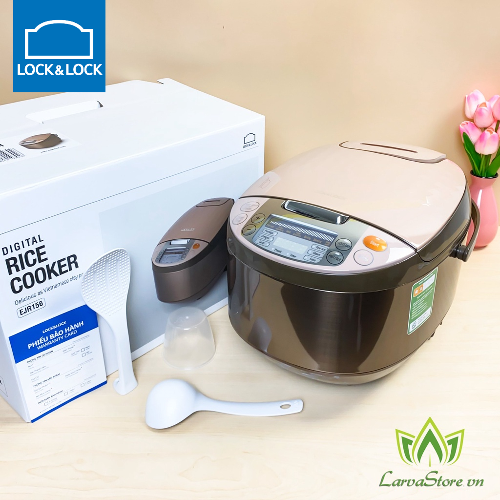 - Nồi đi kèm 1 cốc đong, thìa xới cơm, muôi múc canh và xửng hấp, dung tích 1.8 lít phù hợp sử dụng cho gia đình có 4 - 6 thành viên. - Nồi cơm điện Lock&Lock EJR156 có thiết kế thanh lịch, tinh tế với tông màu nâu đẹp mắt, tạo điểm nhấn cho không gian bếp của bạn. - Nồi có vỏ ngoài làm từ nhựa ABS và nhôm bền bỉ, chịu lực và cách nhiệt tốt. - Quai nồi cũng được làm từ nhựa cách nhiệt chắc chắn, giúp bạn di chuyển nồi thuận tiện. Nồi cơm điện tử EJR156 có lòng nồi làm từ nhôm dày dặn, phủ lớp chống dính cao cấp và bền bỉ, không thôi nhiễm các chất độc hại ở nhiệt độ cao. Lớp chống dính này sẽ giúp hạt cơm chín tơi xốp mà không bị sát xuống đáy nồi gây cháy khét, giúp bạn dễ vệ sinh, lau chùi. - Nồi cơm điện tử EJR156 có lòng nồi làm từ nhôm dày dặn, phủ lớp chống dính cao cấp và bền bỉ, không thôi nhiễm các chất độc hại ở nhiệt độ cao, dễ vệ sinh nồi - Nồi cơm điện EJR156 có bảng điều khiển điện tử với các nút chức năng được mô tả rõ ràng và một màn hình hiển thị giúp bạn quan sát và điều chỉnh dễ dàng. Ngoài nấu cơm, nồi còn được tích hợp nhiều chức năng khác như nấu cháo, nấu soup, làm bánh, hấp,... đáp ứng đầy đủ nhu cầu sử dụng cho bạn.