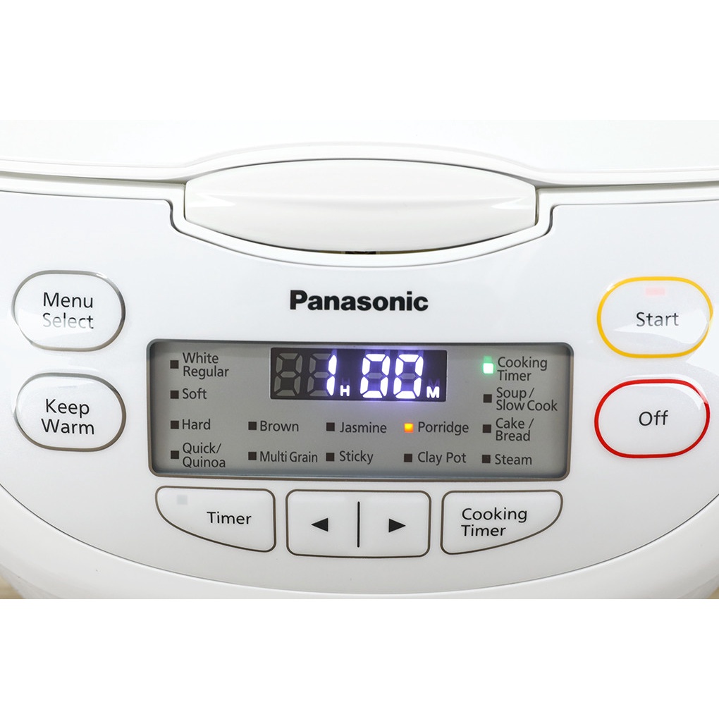 Nồi cơm điện tử Panasonic SR-CL188WRAM Nồi cơm điện tử Panasonic kiểu dáng bo góc mềm mại, màu trắng trang nhã, đẹp mắt trong không gian bếp hiện đại Dung tích 1.8 lít phục vụ tốt khẩu phần ăn cho gia đình 4 - 6 người Lòng nồi dày 2.2 mm, chất liệu hợp kim nhôm phủ lớp chống dính bền bỉ, cho khả năng gia nhiệt tốt, giữ ấm lâu, dễ vệ sinh Nồi cơm điện nấu cơm chín đều và ngon, tăng thời gian giữ ấm với công nghệ nấu 3D kết hợp mức công suất 765W Nồi có khả năng giữ ấm đến 12 giờ và hẹn giờ đến 24 giờ, hỗ trợ bạn nấu nướng linh hoạt thời gian trong ngày. Bảng điều khiển nút nhấn có màn hình hiển thị dễ dùng Nồi có 16 chương trình tự động: nấu thông thường, cơm mềm, cơm khô, nấu nhanh, hạt Quinoa (diêm mạch), gạo lứt, gạo thơm (gạo lài Jasmine), gạo nếp (xôi), ngũ cốc, cháo, cơm niêu, súp, nấu chậm, làm bánh/bánh mì, hấp và giữ ấm. Van thoát hơi thông minh giúp hạn chế cơm nhão, bảo toàn vitamin trong gạo, nấu cơm ngon và giàu dinh dưỡng hơn Nắp trong tổ ong hạn chế đọng hơi nước, có thể tháo rời để tiện lau chùi