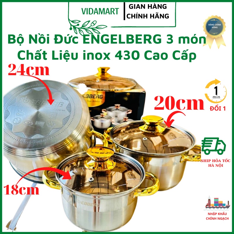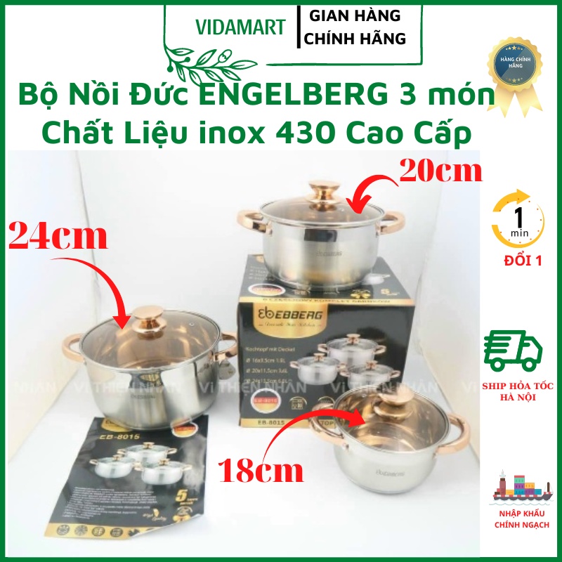 Bộ nồi Đức ENGELBERG 3 món. Bộ nồi inox Đức dùng được các loại bếp. Bộ nồi Đức 3 món dẫn nhiệt tốt, tiết kiệm thời gian đun nấu. Bộ 3 nồi INOX Đức giá rẻ.