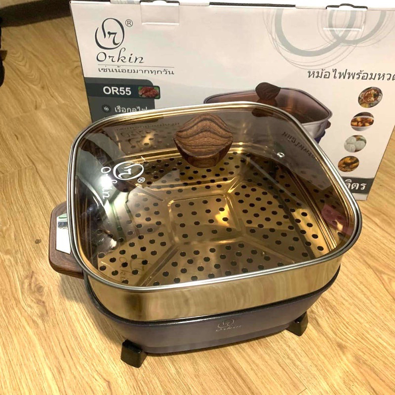 Tên sản phẩm: NỒI LẨU ĐIỆN CÓ XỬNG HẤP Mã sản phẩm : OR55 Thương hiệu: Orkin Thái Lan Điện áp : 220V50Hz Công suất : 1500w Dung tích : 5,5 ít Thanh đốt nhiệt: 2 vòng Chức năng: lẩu, nấu canh, chiên, xào, rán... Thân nồi: Thép sơn tĩnh điện. Lòng nồi: Hợp kim nhôm phủ 4 lớp chống dính tăng độ bền cho sản phẩm. Vung/nắp: Vung kính thủy tinh trong suốt, chịu nhiệt. Trọng lượng 5kg cả vỏ Kích thước: 30 x 30 x 8cm (chiều cao cả xửng là 20cm) Bộ điều chỉnh nhiệt: Núm xoay 5 nấc nhiệt Nồi lẩu điện Orkin OR55 có 6 chức năng chính như sau: Nấu ăn, Hầm, Hấp, Chiên, Rán, Rang xào Made in Thailan (Phân phối bởi công ty ACQ Việt Nam - Đại diện hãng Orkin tại Việt Nam) Bảo hành 12 tháng