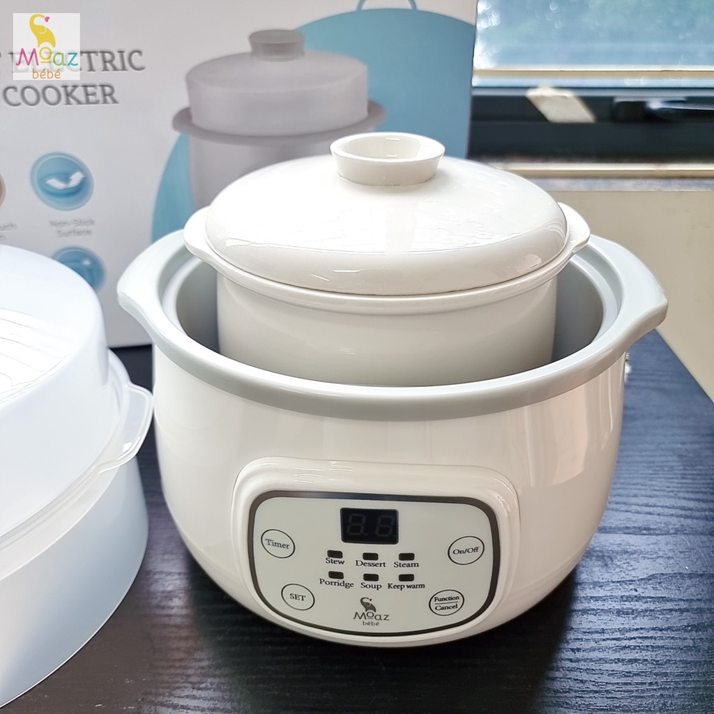 NỒI NẤU CHẬM MOAZ BÉBÉ MB-030 Chức năng sản phẩm: -Thiết kế hiện đại, bảng điều khiển cảm ứng, linh hoạt. - Đa chức năng: Nấu súp, nấu đồ ngọt (chè dưỡng nhan), đồ hấp, nấu cháo, hầm canh, hẹn giờ và giữ ấm. - Chất liệu lõi sứ cao cấp, dày dặn giữ nhiệt tốt và dễ dàng vệ sinh. - Chế độ chống cạn, chống cháy khét. - Chế độ nấu chậm gia nhiệt đa chiều, sử dụng mức nhiệt vừa đủ chín thẩm thấu từ từ giúp món ăn giữ được hương vị tươi ngon mà không bị mất đi chất dinh dưỡng. - Dung tích: 1.5L, nhỏ gọn phù hợp với không gian bếp của gia đình. Thông số kỹ thuật: 220V, 50Hz, 260W. Bảo hành: 12 tháng Sản xuất: tại Trung Quốc