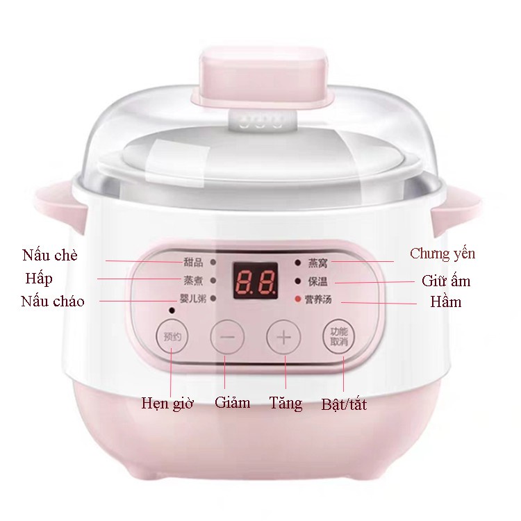 6 chế độ nấu: hấp, luộc, hầm canh, nấu cháo, chưng yến, nấu chè Công nghệ hầm cách thủy làm nóng thức ăn từ từ, giữ nguyên cấu trúc dinh dưỡng của thực phẩm Chống trào, chống dính, chống cháy đáy nồi Lõi gốm sứ tự nhiên cao cấp, giữ và truyền nhiệt đều Hẹn giờ dễ dàng, từ nấu nhanh/ chậm đến giữ ấm tự động tới 9.5h Có chức năng hẹn nấu : 24h Tự động ngắt nếu phát hiện bị chập cháy rất an toàn khi sử dụng Luôn giữ nhiệt trong vòng 48h kể cả khi đã tắt Dung tích 1L vừa đủ cho gia đình nhỏ 2 người hoặc nấu đồ ăn cho bé: Nồi Ninh hầm cách thuỷ , nấu cháo, nấu chè, hầm gà, chưng yến gì cũng được ạ . Đặc biệt hơn tất cả các loại các loại nồi trên thị trường hiện nay vì nồi có thể vừa nấu cháo vừa hấp củ quả được. Các mẹ chỉ việc cho đồ cần nấu vào nồi rồi ấn nút là bé đã có 1 bữa cháo ngon lành đầy đủ chất dinh dưỡng. Không lo cháy, không lo trào, không phải trông nồi. Nấu quá nhàn mà vẫn đầy đủ chất dinh dưỡng cho bé Dung tích 1L đủ 3 bữa cháo cho bé, các mẹ có thể nấu từ tối hôm trước để sáng hôm sau bé dậy có cháo ăn luôn, hết thời gian nấu nồi tự chuyển sang chế độ giữ nhiệt