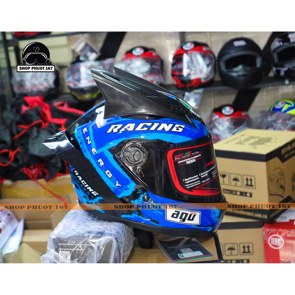 Ô Tô & Xe Máy & Xe Đạp > Mũ bảo hiểm > Mũ bảo hiểm fullface > Nón bảo hiểm Fullface AGU Tem Racing Xanh Dương mới nhất, kèm đuôi gió và tai rùa, có túi đựng nón