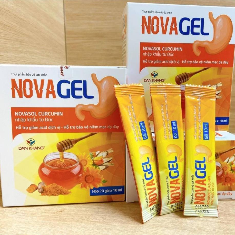+Cách dùng Novagel Ngày uống 2-3 lần, mỗi lần 1 gói 10ml. Uống trước bữa ăn 30 phút hoặc uống khi đau. • Không nên sử dụng cùng thuốc khác trong vòng 2-4 tiếng khi uống Novagel Nên sử dụng Novagel khi có triệu chứng dư acid: trào ngược, ợ nóng, khó tiêu. Sử dụng khi đau trong vòng 1-2 tuần. Nếu hết triệu chứng đau nên sử dụng thêm viên uống Novacurmin từ 1-2 viên/ ngày để làm lành vết loét.