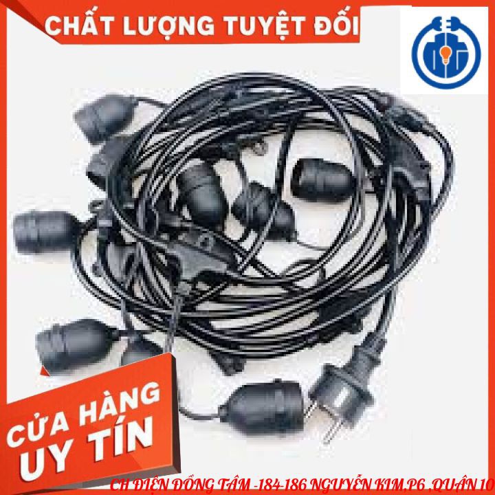 - Độ dài: 10 mét 15 đuôi đèn - Bóng đèn: Không có ( Khách tự mua bóng theo ý mình ) - 15 đui đèn E27 thông dụng rủ xuống ( 15 cm ) chống nước, đúc chắc chắn. - Dây cáp điện dày chắc chắn 2 lớp, đui đèn đúc phủ nhựa chống cháy màu đen nhám. - Mỗi chỗ có đui đèn đều có thiết kế lỗ nhỏ dùng để treo hoặc móc lên bằng Dây rút hoặc móc. ® Đặc biệt cuối mỗi bộ đều có đầu cắm nối tiếp qua bộ khác giúp gia tăng chiều dài bộ dây mà chỉ dùng 1 phích cắm.