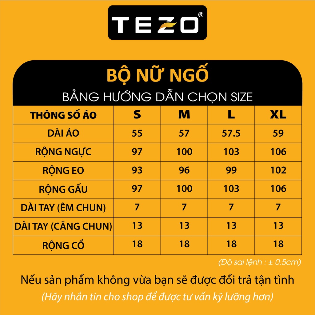 Lưu ý mua hàng: - Bảng size mang sản phẩm mang tính chất tham khảo, tùy thuộc số đo cơ thể và chất liệu từng sản phẩm sẽ có sự chênh lệch nhất định. Vui lòng chat với shop để được nhân viên tư vấn cụ thể. - Quý Khách nên quay lại video trước khi mở sản phẩm để có những sự cố được TEZO xử lý nhanh chóng nhất. - Các sản phẩm Đổi/Trả phải còn nguyên tem mác và chưa qua sử dụng. - Vui lòng đánh giá 5* giúp TEZO để được nhận quà từ TEZO nhé! #dobo#dobonu#dobomacnha#dobonu#dobokieu#dongunu#bodongu#bodongunu#dobongumacnha#bodongu#bodongunumacnha #quanaongu#quanaongunu#quanaomacnha#domacnhacaocap#thoitrangnu#thoitrangmacnha