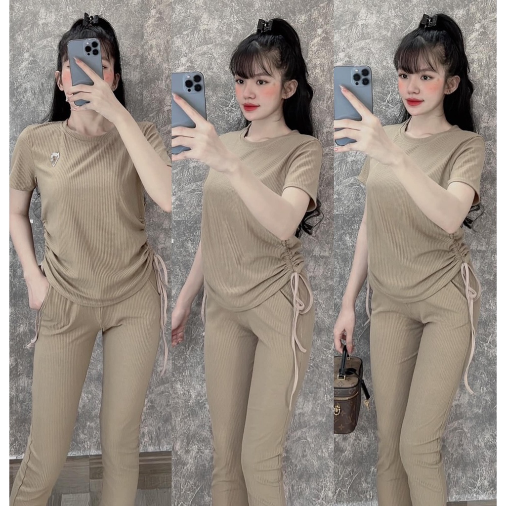 Giới thiệu Đồ bộ nữ, set đồ bộ quần legging đai cao có túi và áo ôm ngắn tay rút dây vải thun cotton gân, đồ mặc ở nhà