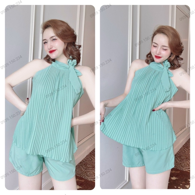 Set bộ đồ ngủ nữ áo yếm lụa cổ nơ dập ly và quần ngắn lưng chun co giãn