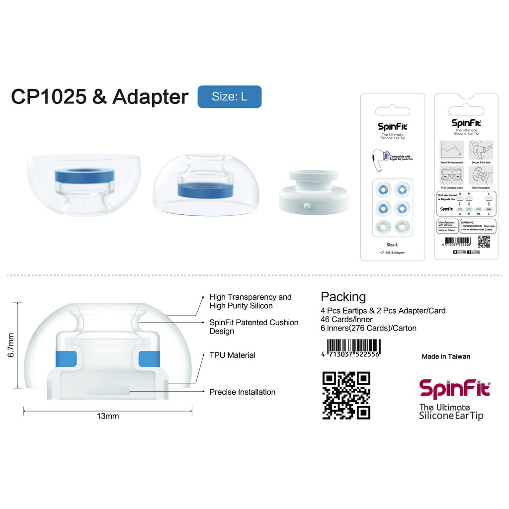SpinFit cung cấp 5 tùy chọn màu sắc cho eartip CP1025 (hồng bụi, cam, xanh lam, xanh mòng két và xanh đậm) cùng 3 tùy chọn màu sắc cho adapter CPA2 (đen, tím và bạc).