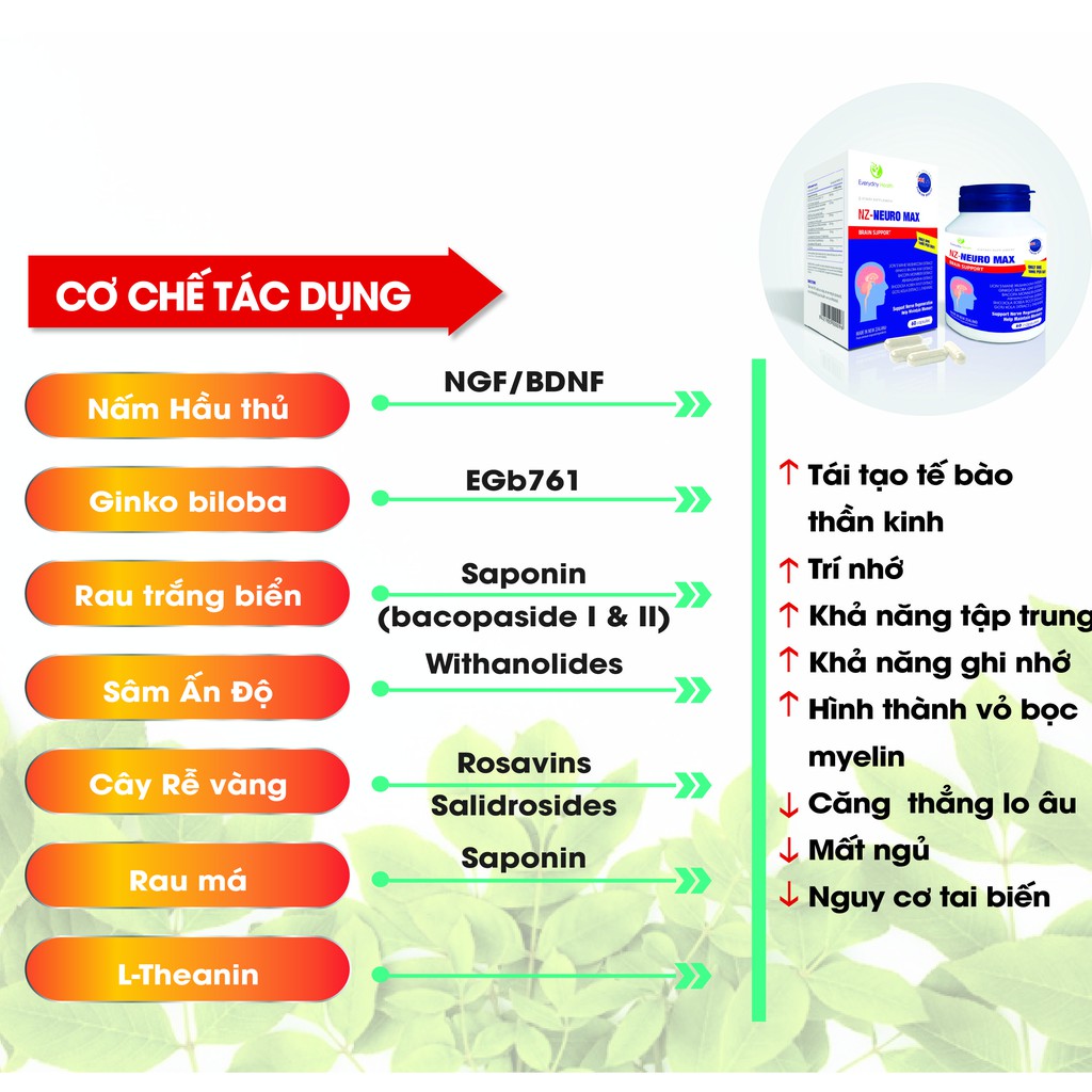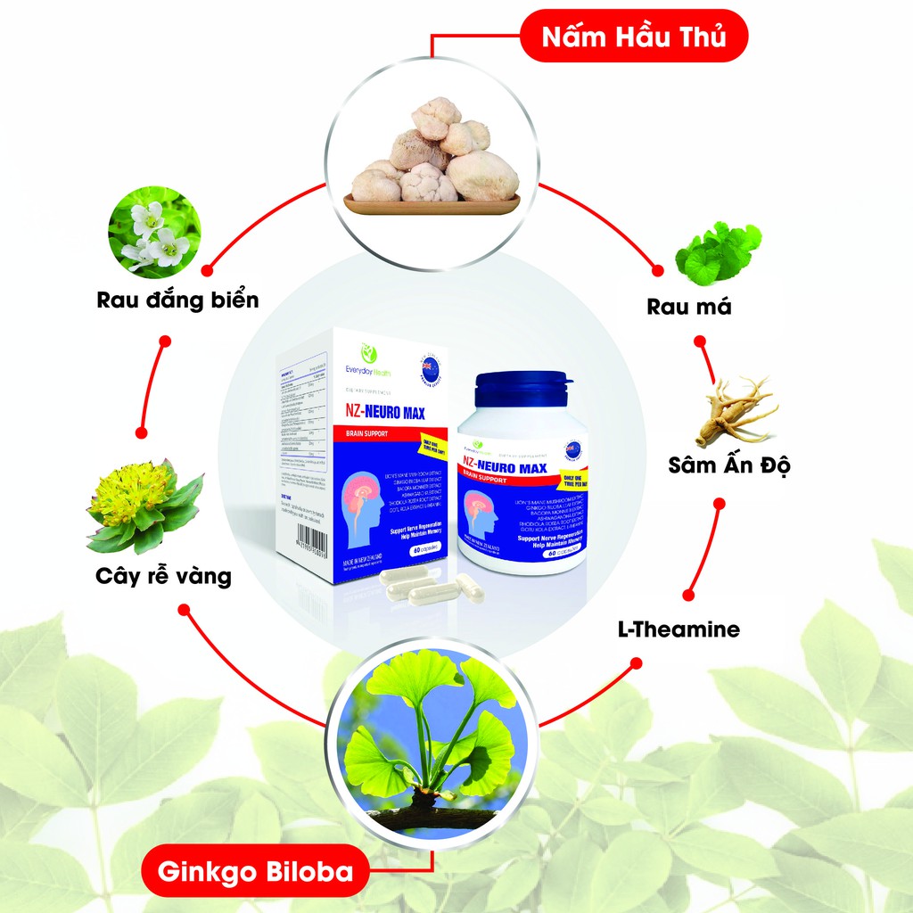 Thành phần NZ-Neuro max Lion’s mane mushroom extract: 500mg Ginkgo biloba leaf extract: 120mg Bacopa monnieri whole plant extract : 100mh Ashwagandha extract: 100mg Rhodiola rosea root extract: 60mg Gotu kola extract: 20mg L-Theanine: 10mg