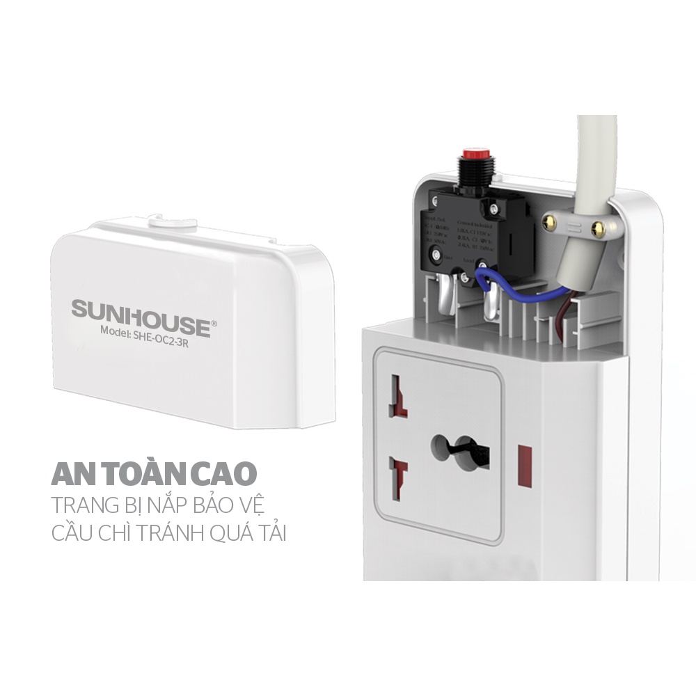 Dụng cụ và thiết bị tiện ích > Thiết bị mạch điện > Ổ điện và dây nối > Ổ cắm điện đa năng Sunhouse SHE-OC2-3R - Có công tắc riêng cho từng lỗ cắm, Ổ cắm 3 lỗ - Dây dài 2,5m