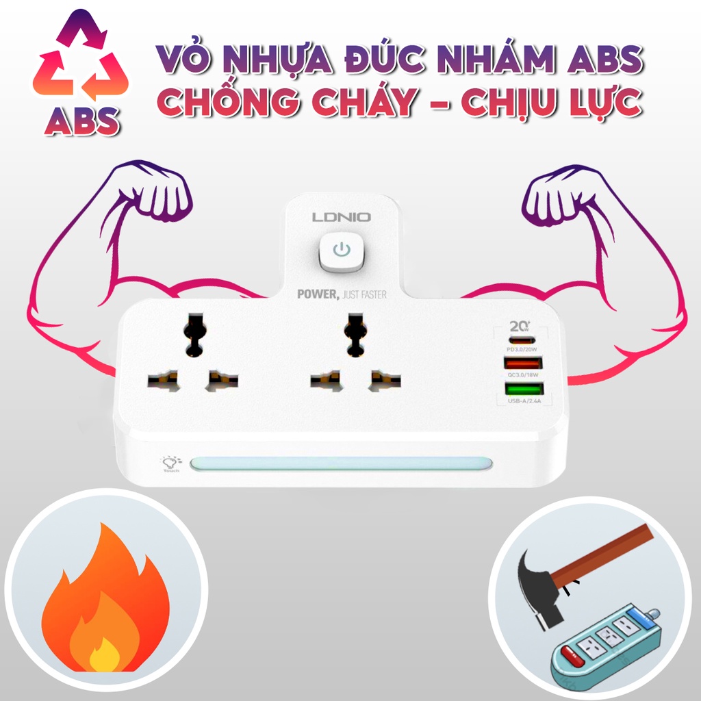 Dụng cụ và thiết bị tiện ích > Thiết bị mạch điện > Ổ điện và dây nối > Ổ Cắm Điện Đa Năng Thông Minh LDNIO SK22 có đèn ngủ sạc nhanh USB-C 20W cổng QC 3.0 18W hai ổ 220V an toàn chống cháy nổ