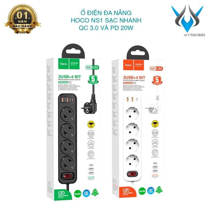 Dụng cụ và thiết bị tiện ích > Thiết bị mạch điện > Ổ điện và dây nối > Ổ cắm điện thông minh HOCO NS1 hỗ trợ 2 USB quick charge và 1 typeC PD 20W - công suất tải đến 4000W (nhiều màu)