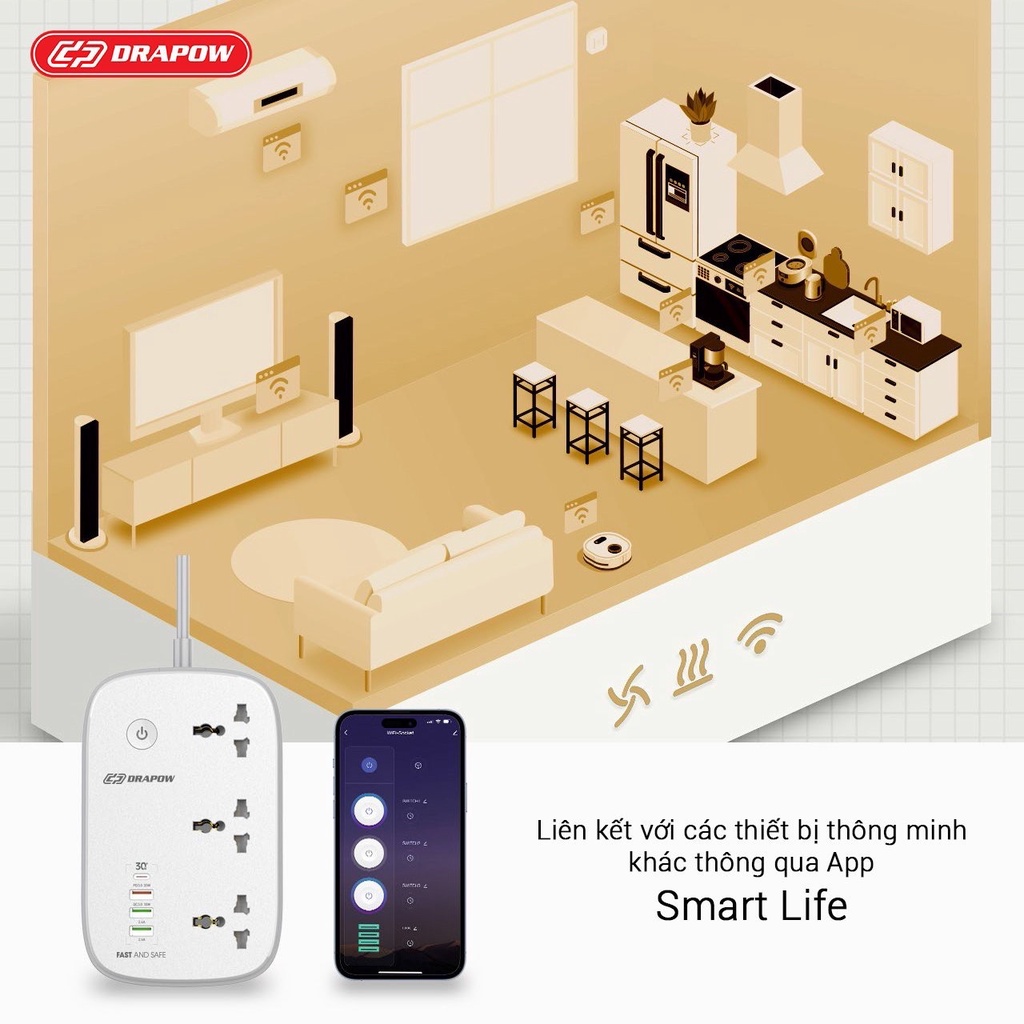 Dụng cụ và thiết bị tiện ích > Thiết bị mạch điện > Ổ điện và dây nối > Ổ cắm điện thông minh kết nối App Drapow SK25 3 ổ cắm điện 2500W 1 cổng type C 30W 1 cổng sạc nhanh Q.C 18W, 2 cổng USBA