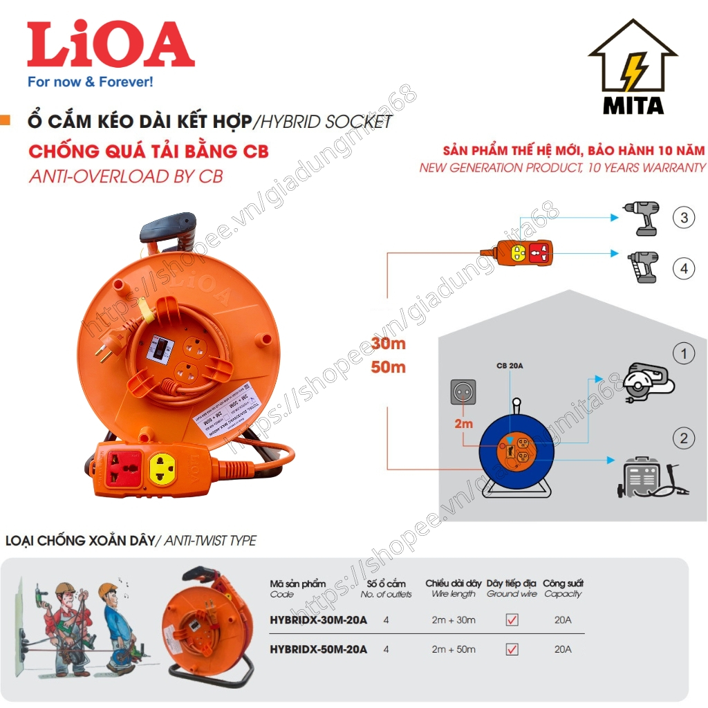 Dụng cụ và thiết bị tiện ích > Thiết bị mạch điện > Ổ điện và dây nối > Ổ Cắm Kéo Dài Quay Tay Kiểu Rulo Hybrid LiOA NEW loại Chống Xoắn dây dài 30m/50m công suất 20A 3 Lõi - MITA