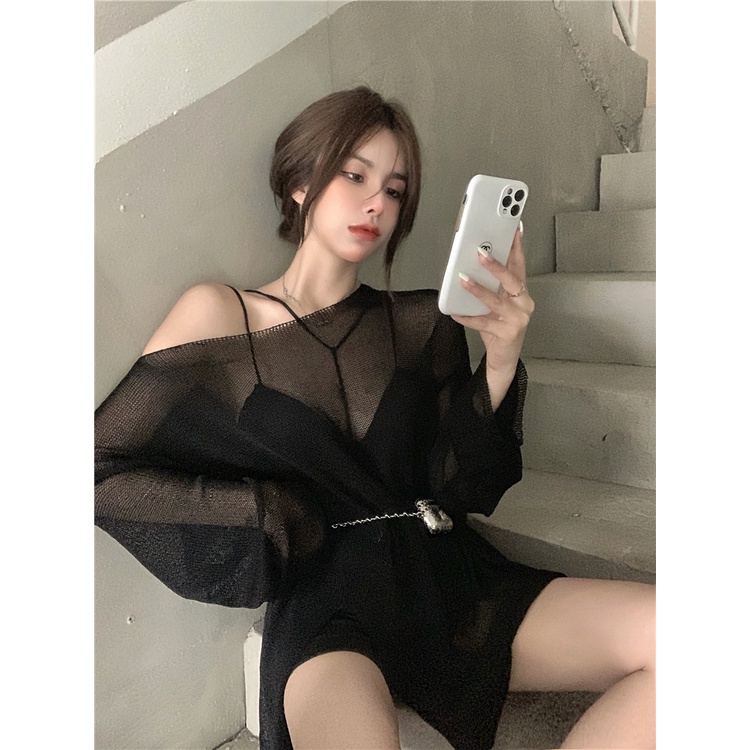 Hàn Quốc mùa hè mới bộ quần áo chống nắng lười nóng cô gái trong suốt dài tay áo chống nắng dệt kim + áo yếm cổ hai dây áo hai mảnh