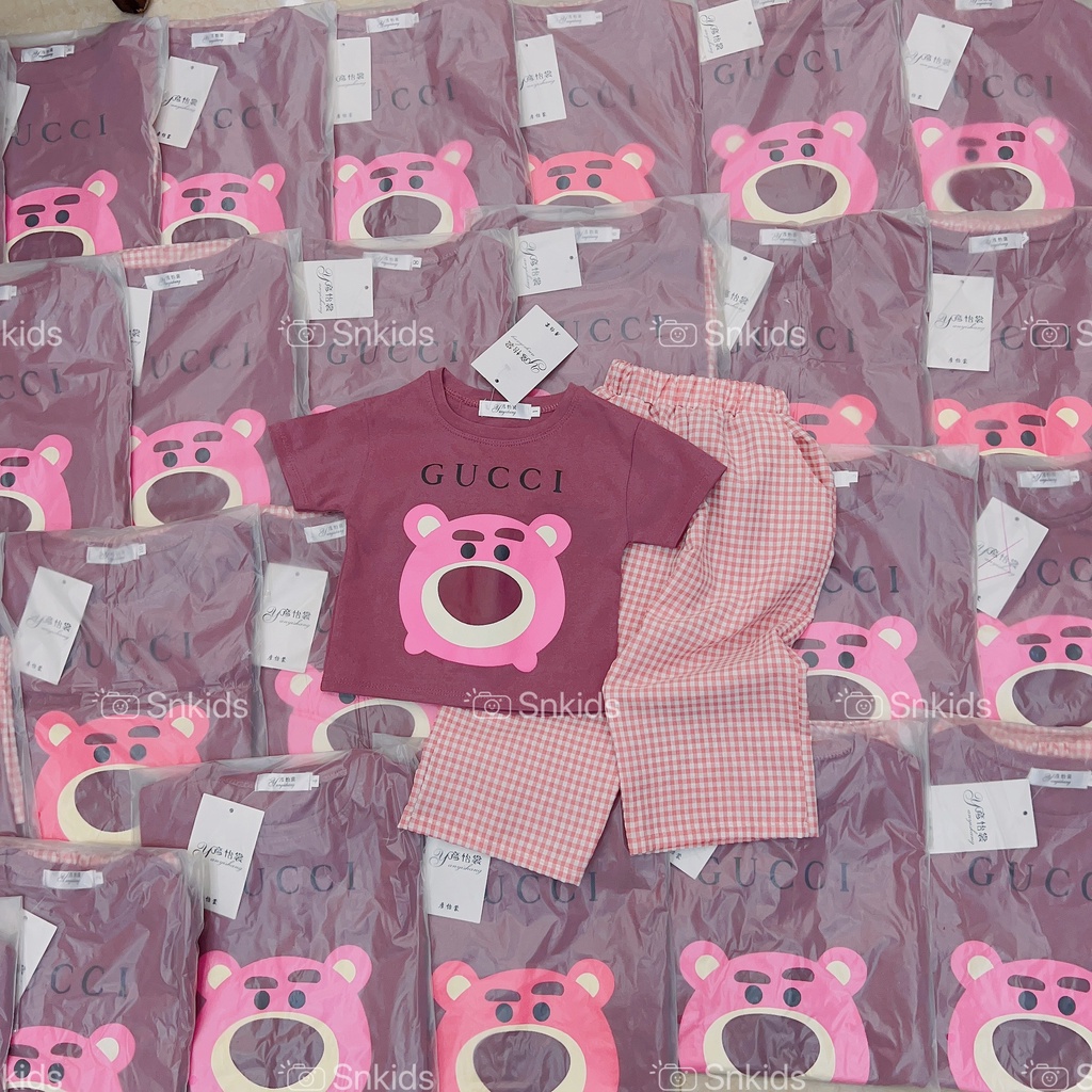 Giới thiệu Bộ áo gấu hồng tím quần kẻ hồng bé gái