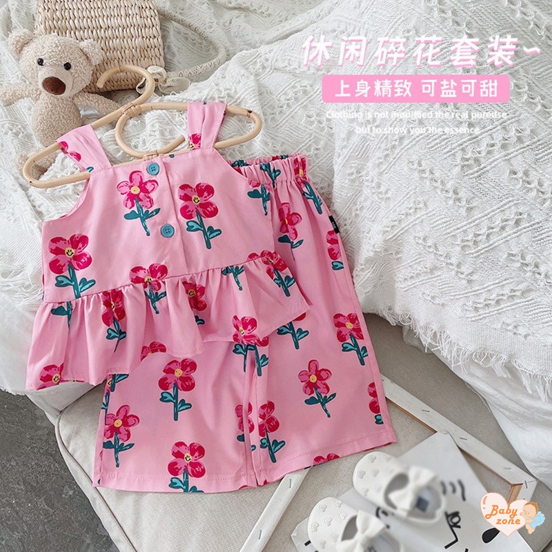 2. Bộ đồ cho bé gái mùa hè phiên bản Hàn Quốc của áo yếm hoa và váy ngắn bộ hai mảnh, làm nổi bật sự ngọt ngào và dễ thương của bé;
