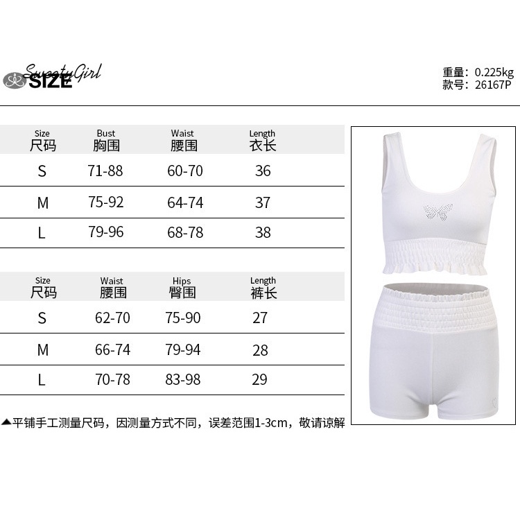 Pattern: Solid color. Color: white, pink, maximum size weight: 225g, fabric: CVC striped 70% cotton plus 30% polyester. Product category: Leisure Package. Content of main fabric composition: 51%-70% Top sleeve length: sleeveless. Trouser length: Shorts. Sizes: S, M, L. Main picture Source: There are models in the real picture. Content of main fabric composition 2: 30%-50% Style type: Street hipsters. Main Fabric Ingredients 2: Polyester (Polyester) Whether cross-border export supply source: Yes. Popular elements: wood ear, drill, back, stitching, 3D/ stereoscopic pattern. Style: Pants set. Origin: Guangzhou. Main fabric ingredients: cotton. Top style: Vest. Pants style: straight pants. Style: Street. Process: Collage/stitching.