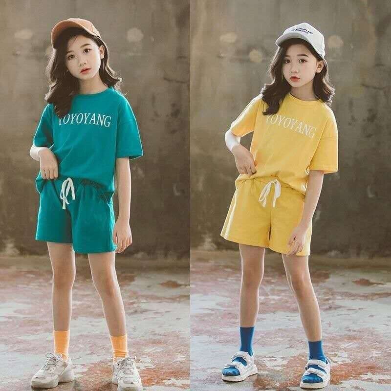 Giới thiệu Bộ Áo Thun In Chữ + Quần Short Cotton Màu Xanh Lá Thời Trang Mùa Hè Cho Bé Gái 5-12 Tuổi