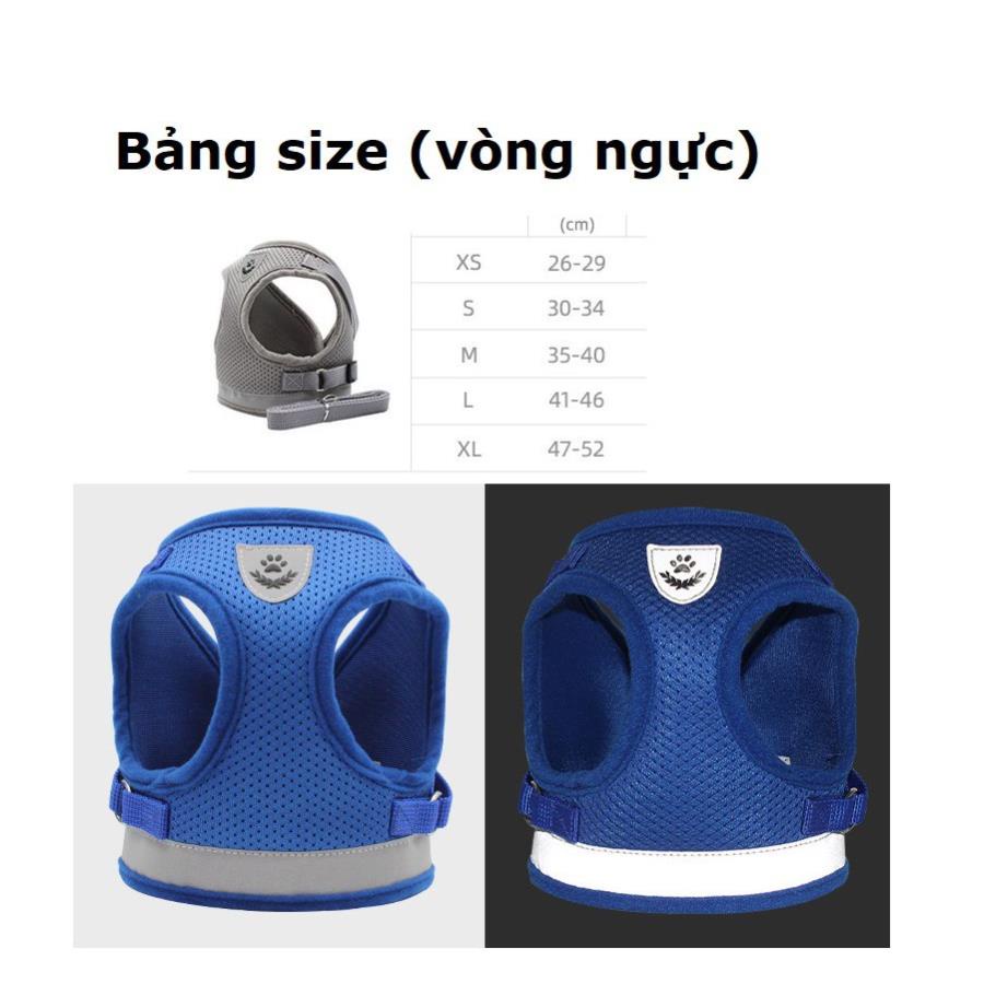 THÔNG TIN SẢN PHẨM Thỉnh thoảng bạn muốn đưa thú cưng của mình đi chơi. Bạn không thể quản lý được những chú chó hay nhưng chú mèo tăng động luôn thích chạy nhảy khắp nơi. Áo ngực kèm dây dắt cho chó mèo sẽ là sự lựa chọn rất tốt cho bạn. Sản phẩm không làm đau mà lại dễ dàng giúp bạn quản lý thú cưng hơn. Size: (nên đo vòng ngực của bé sẽ chuẩn hơn căn cứ trọng lượng các bé) XS: Vòng ngực 26-29cm S: Vòng ngực 30-34cm M: Vòng ngực 35-40cm L: Vòng ngực 41-46cm XL: Vòng ngực 47-52cm