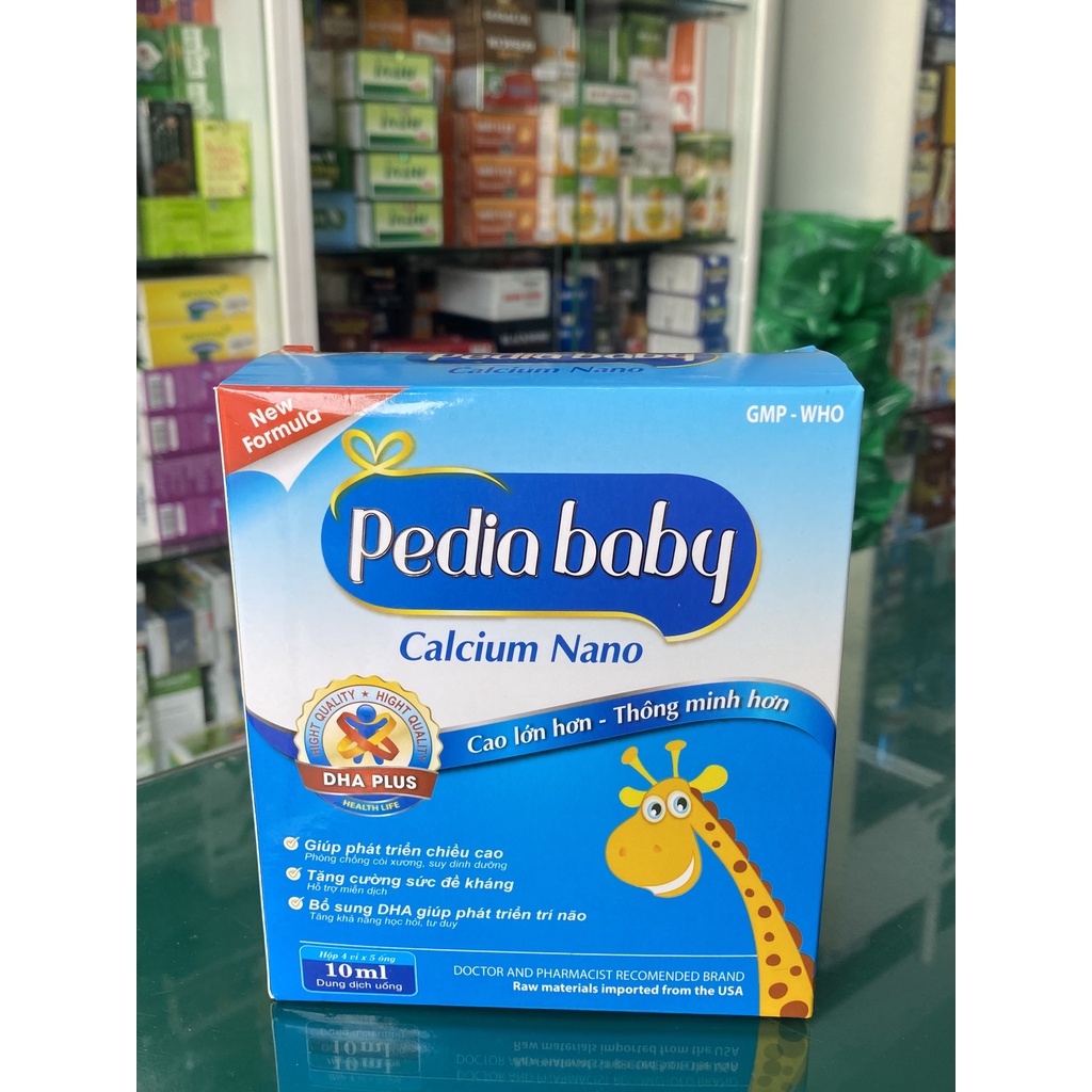 Công dụng của Pediababy Calcium Nano Pediababy Calcium Nano là thực phẩm bảo vệ sức khỏe có công dụng giúp hỗ trợ bổ sung canxi và vitamin D3 cho cơ thể, hỗ trợ cho sự hìnCách sử dụng Pediababy Calcium Nano Cách dùng : Trẻ dưới 1 tuổi: Tham khảo ý kiến bác sỹ, dược sĩ trước khi sử dụng. Trẻ 1-6 tuổi: Uống 1 ống/lần x 1-2 lần/ngày. Trẻ từ 6-9 tuổi: Uống 1 ống/lần x 2-3 lần/ngày. Trẻ trên 9 tuổi và người lớn: Uống 2 ống/lần x 2-3 lần/ngày.