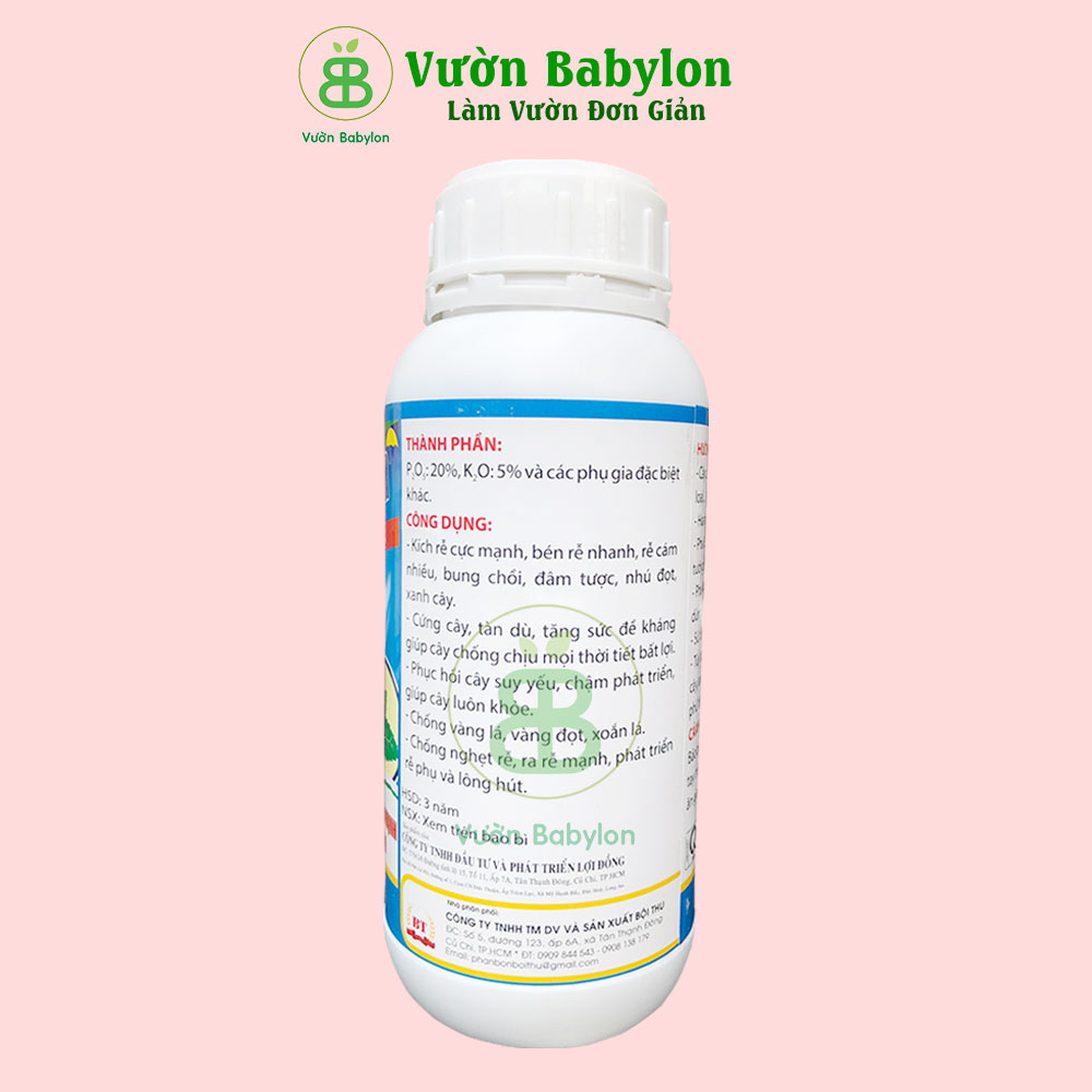 Công dụng - Kích rễ cực mạnh, bén rễ nhanh, rễ cám nhiều, bung chồi, đâm tược, nhú đọt, xanh cây - Cứng cây, tàn dù, tăng sức đề kháng giúp cây chống chịu mọi thời tiết bất lợi - Phục hồi cây suy yếu, chậm phát triển, giúp cây luôn xanh khỏe - Chống vàng lá, vàng đọt, xoắn lá - Chống nghẹt rễ, ra rễ mạnh, phát triển rễ phụ và lông hút