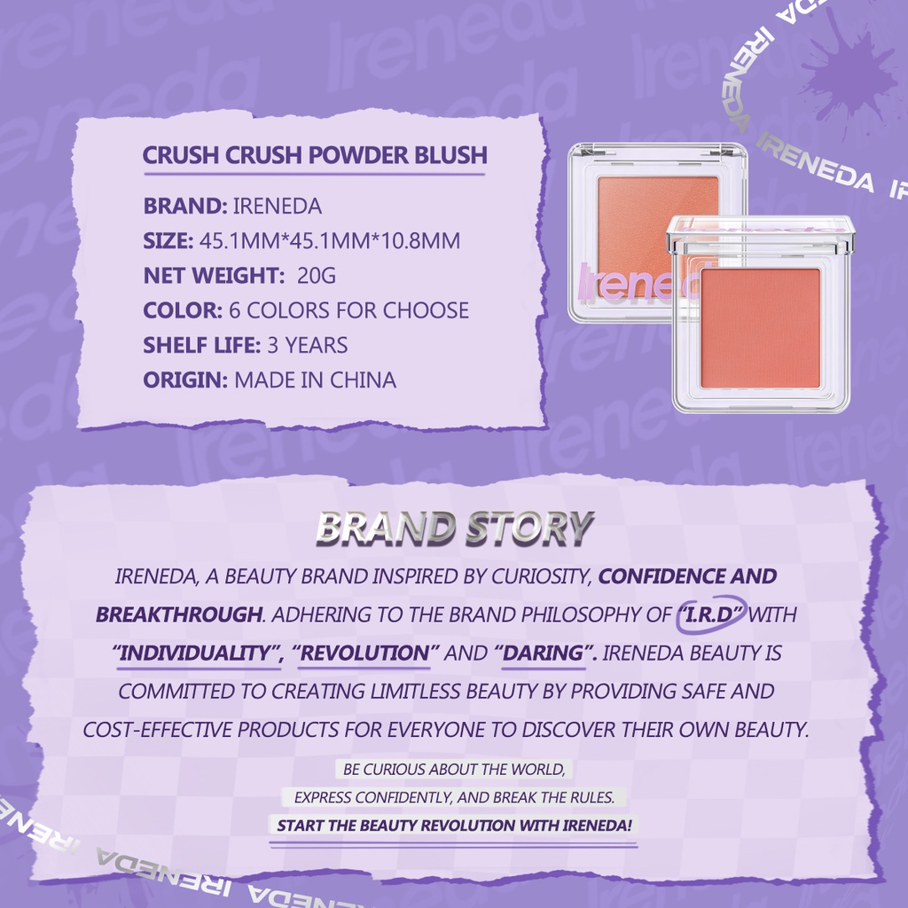 Phấn má hồng Ireneda Crush Crush Powder dành riêng cho bạn, một loại phấn má hồng tự nhiên giúp làm đều màu da của bạn và làm cho đôi má của bạn trông ửng hồng xinh xắn!