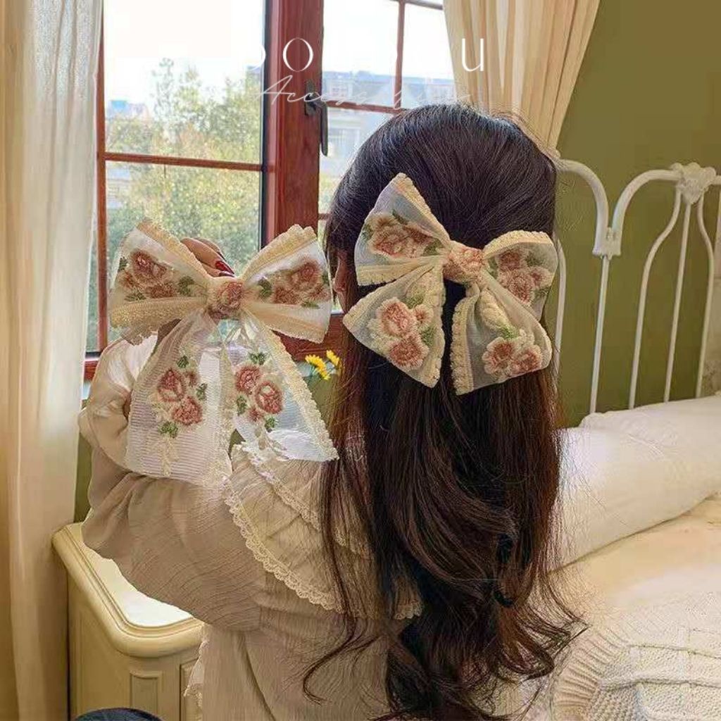 Tên sản phẩm: Phụ kiện kẹp tóc xinh DOUDOU Cặp tóc Kẹp tóc nơ tiểu thư thêu hoa công chúa nàng thơ phong cách Hàn Quốc Hottrend FJ017