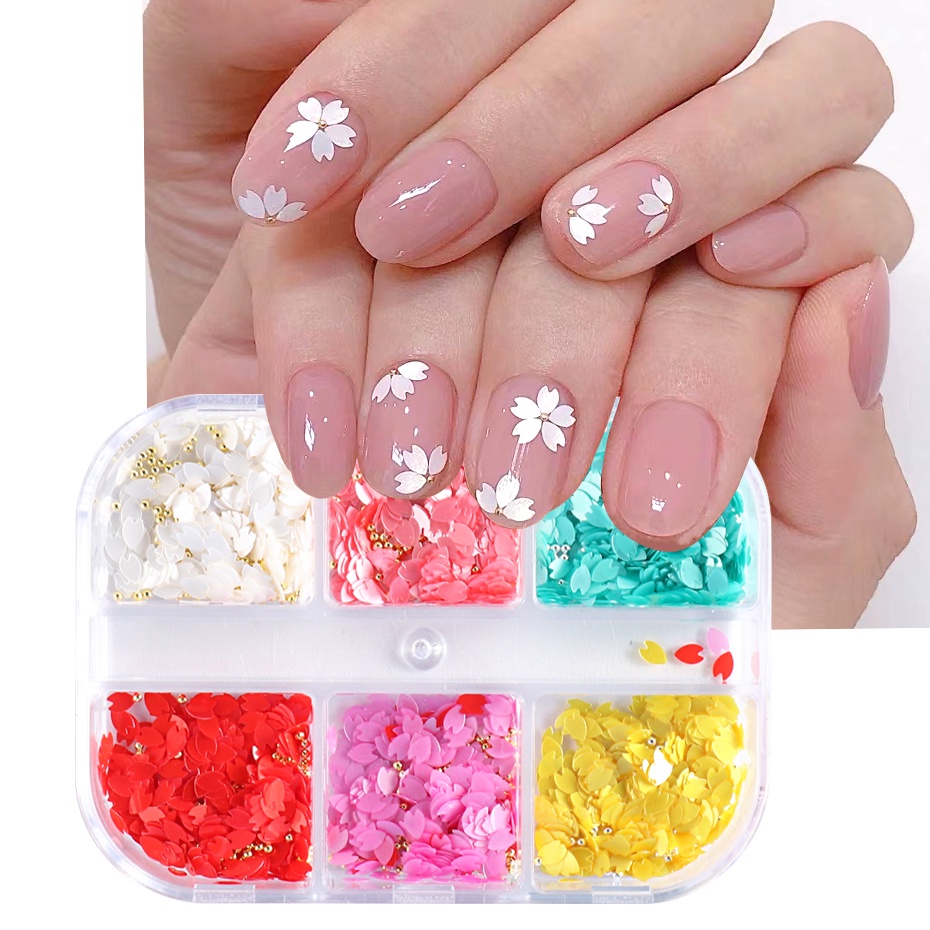 Mô tả Số lượng: 6grids / Case Màu: Xanh lam Vàng Nâu Bạc Xanh lục Kiểu: Hoa anh đào cánh hoa Mô hình: Hình vuông Cách sử dụng: Trang trí nghệ thuật móng tay tự làm