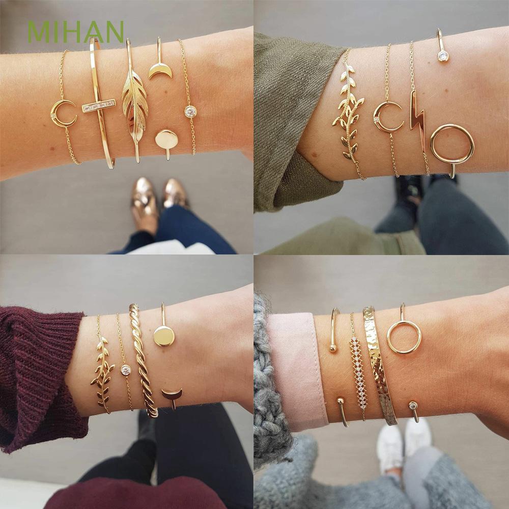 Bộ vòng tay kiểu mở thiết kế hình lá và mặt trăng có thể điều chỉnh kích thước