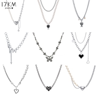 Vòng cổ 17KM Y2K mạ bạc mặt hình trái tim đính ngọc trai giả thời trang