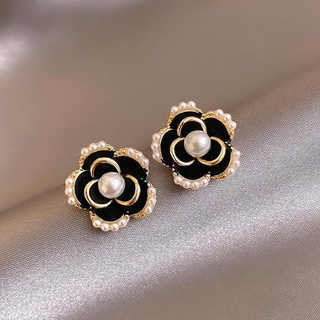 Bông Tai Mạ Bạc 925 Hình Hoa Hồng Đen Đính Ngọc Trai Phong Cách Hàn Quốc