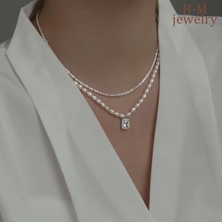 Vòng cổ Bạc S925 Mặt Vuông Đính Đá Và Ngọc Trai Nhân Tạo Mới