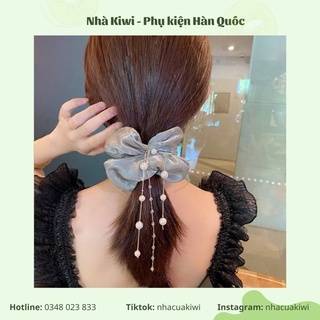 Cột tóc scunchies vải agenda kem tua rua phong cách tiểu thư Hàn Quốc