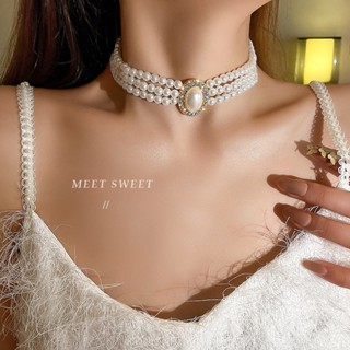 Vòng cổ Ba Lớp Đính Ngọc Trai Kim Cương Lấp Lánh Phong Cách Retro Pháp Cho Nữ