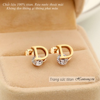 Khuyên tai titan nữ không gỉ thiết kế chữ D kẹp đá pha lê thời trang thanh lịch