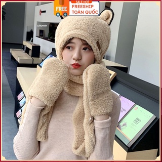 PVN35530 Mũ lông cừu 3in1 tai gấu kèm khăn quàng cổ và bao tay kiểu dáng hàng quốc, mũ len tai gấu cho bạn gái T2 .