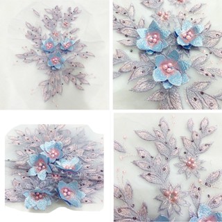 1 Miếng Vải Thêu Hoa Đính Ngọc Trai Giả Màu Tím / Xanh Dương Dùng Để Trang Trí Quần Áo DIY