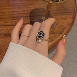 Nhẫn Hình Hoa Trà Đen Đính Kim Cương Nhân Tạo Phong Cách Hàn Quốc