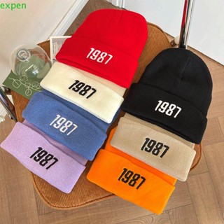 Mũ beanie dệt kim màu trơn giữ ấm bảo vệ tai thêu chữ số 1987 dễ thương thời trang cho nữ