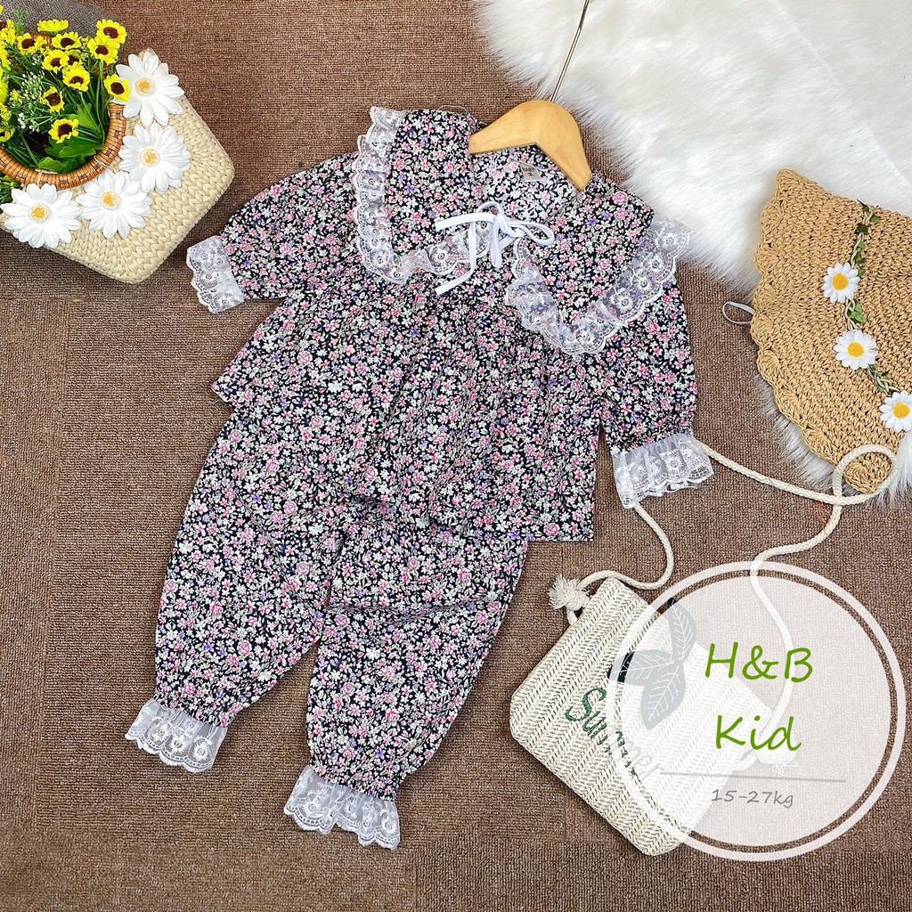chất liệu thô hoa mềm đẹp phối ren cổ xoè bản to- đáp ren cả tay và ống quần tạo điểm nhấn