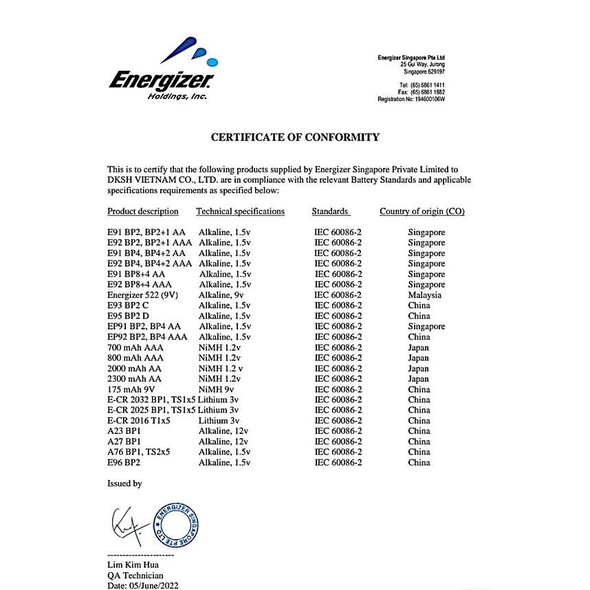 ⬇️ Đặc trưng của Pin CMOS Energizer CR2032 - 2032 Lithium 3v ⚡️ Pin Energizer CR2032 là dòng pin chất lượng cao được sản xuất trên công nghệ hiện đại từ chất liệu Lithium được dùng cho rất nhiều thiết bị hàng ngày như chìa khóa xe, máy ảnh , máy trợ thính, máy tính,…. ⚡️ Với những cái tiến mới nhất, Pin CMOS Energizer CR2032 lưu trữ năng lượng lên đến 10 năm, chịu được nhiệt độ cao. ⚡️ Pin được sản xuất đáp ứng tốt các tiêu chuẩn về kỹ thuật và tính an toàn cho người sử dụng.