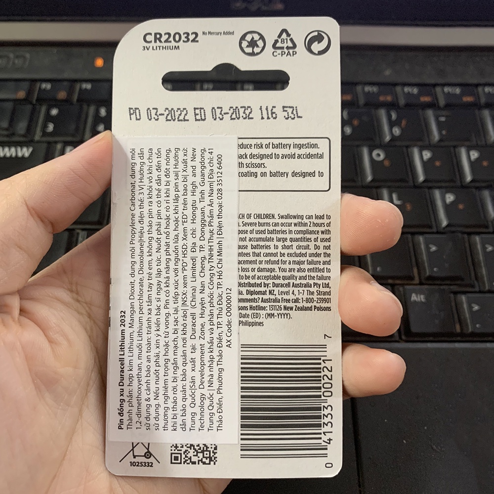 Hãng sản xuất: DURACELL Loại pin: CR2032 Kích thước: Đường kính 20mm, độ dày 3.2mm Điện thế: 3V Hạn bảo quản: 10 năm kể từ ngày sản xuất (in trên bao bì) Chất liệu: Pin được làm bằng chất liệu Lithium giúp pin lưu trữ được lượng điện năng lớn trong thời gian dài, không han rỉ Thiết bị sử dụng: Đồng hồ, đồ chơi, thiết bị y tế, chìa khóa Ô tô- xe máy, điều khiển quạt, cân điện tử, máy đo đường huyết...