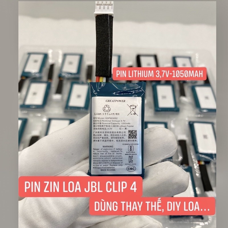 Thông số kỹ thuật ở sản phẩm này: Model: Pin JBL Clip 4 Loại pin: Li-Po (Lithium Polymer) Chứng chỉ tiêu chuẩn: GB/T18287 -2016 Điện thế ra (voltage)...........................3.7V Dung lượng (capacity ) ................. 1050 mAh