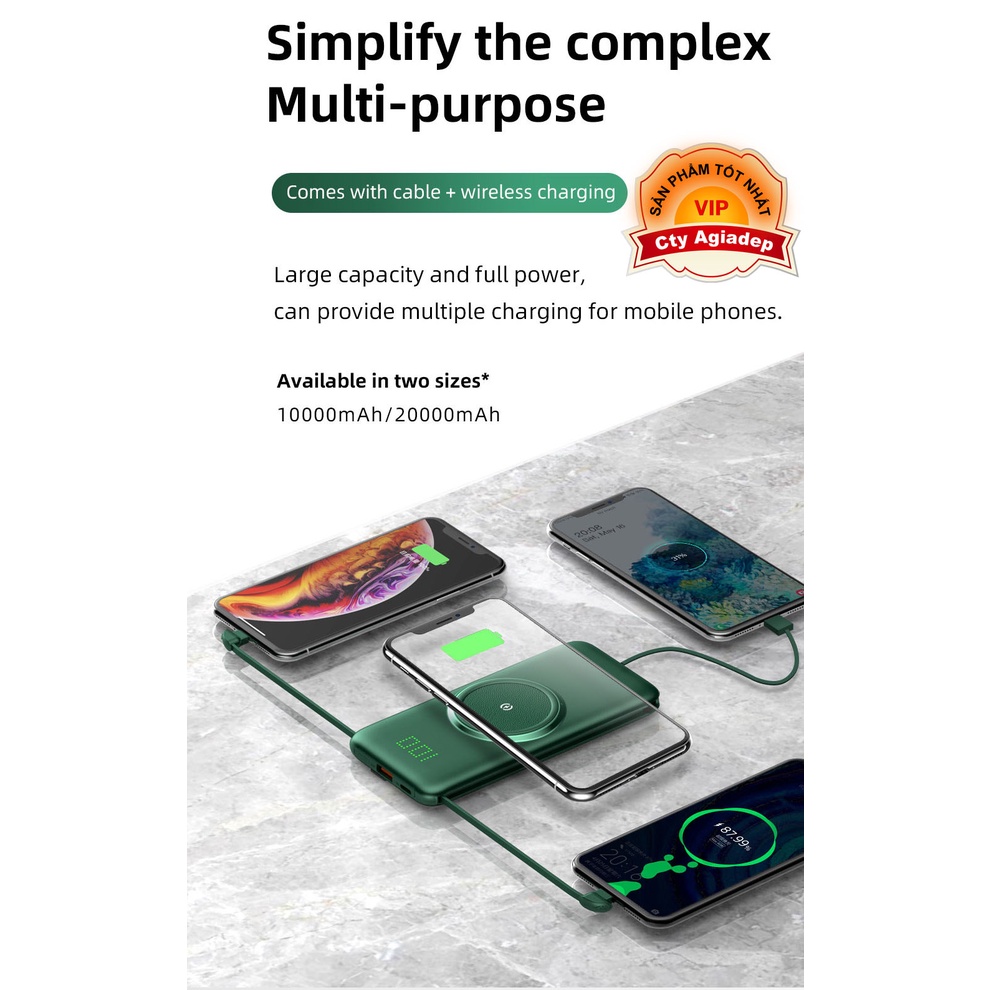 Có 2 kích thước (10000mAh / 20000 mAh) Hàng có sẵn Feature1: Sạc Không Dây Feature2: Đi Kèm với cáp sạc Feature3: Ba đầu ra và hai đầu vào Feature4: Vô Hình Màn hình hiển thị công suất Sản phẩm tốt So Sánh chất lượng