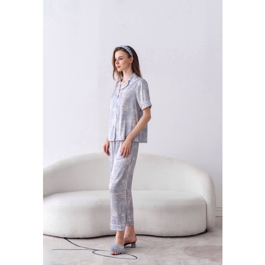 Bộ Đồ Pyjama Nữ LILAS BLANC Lụa Mịn Cao Cấp Tay Cộc Quần Dài Phối Viền Trắng