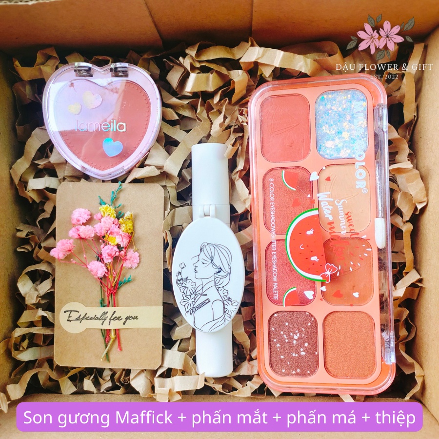 Giới thiệu Quà sinh nhật cho nữ, set quà gồm phấn mắt, phấn má, son gương và thiệp dễ thương