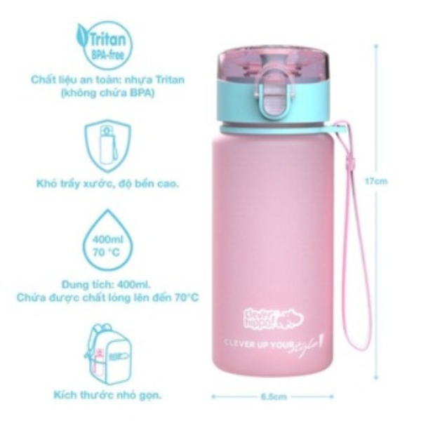 - Chất liệu: Tritan, không chứa BPA(*), an toàn cho sức khỏe của bé. - Thiết kế khóa và nắp bật tiện lợi. - Thiết kế vừa tay bé, có quai cầm chắc chắn, chống trơn trượt phù hợp cho việc đi học, đi chơi, đi du lịch, ... - Thiết kế nhỏ gọn, phù hợp cho các ngăn chứa bên hông của balo.